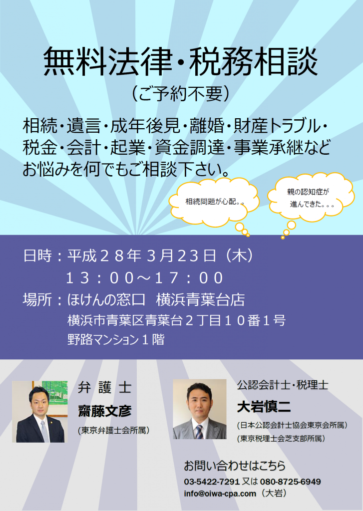 | お問い合わせ先 | 大岩慎二公認会計士・税理士事務所Tel:03-5422-7291又は080-8725-6949Mail:info@oiwa-cpa.com※お気軽にお問い合わせください。 |